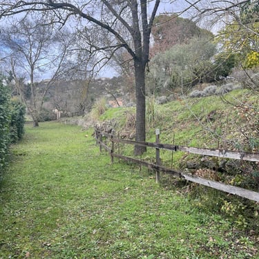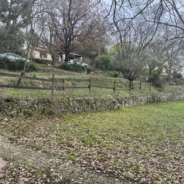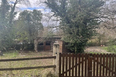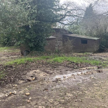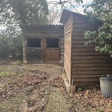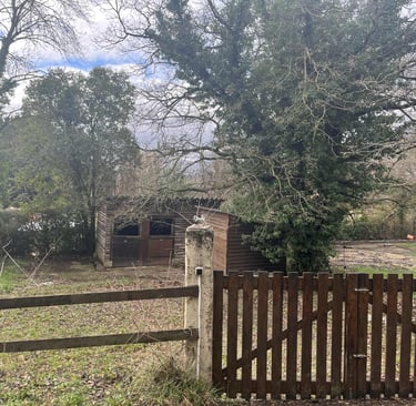 Parking, garage indépendant, espace avec boxes à chevaux, prairie et cabanon en pierres.